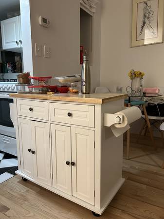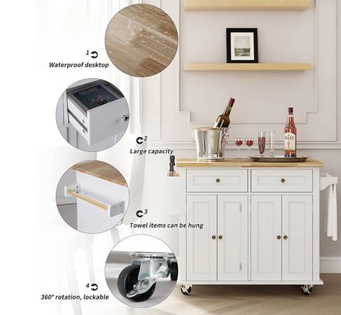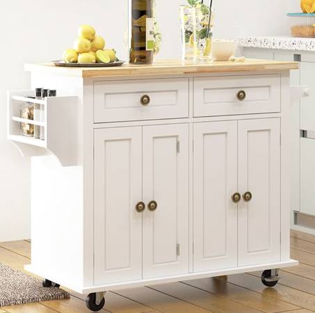 Pre built rolling kitchen island with 2 drawers, 2 cabinets, and 4 opened doors. Made of natural solid rubber wood top and MDF, which is durable. Can be used both indoors and outdoors.