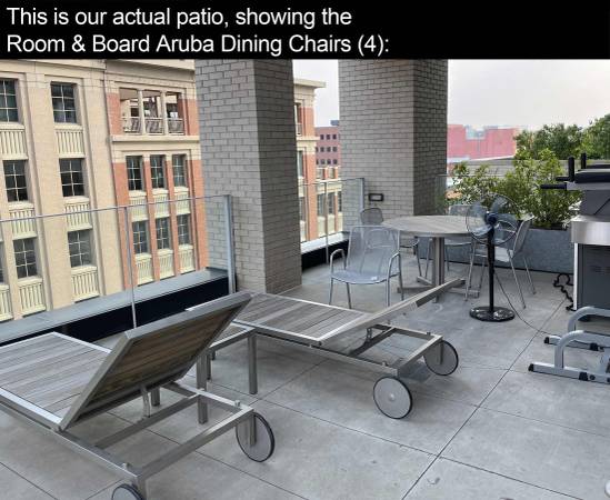 These are gorgeous, clean and modern patio dining chairs / outdoor dining chairs. Practically new condition. Very high-quality Room and Board outdoor furniture.