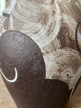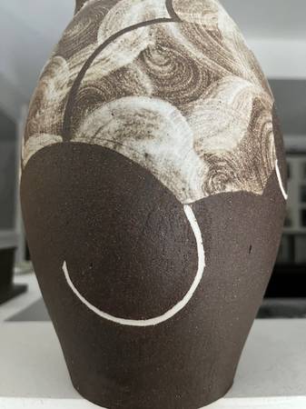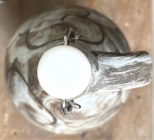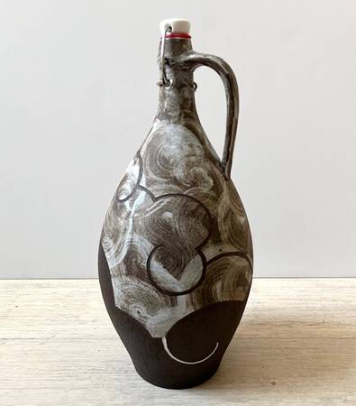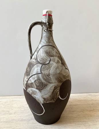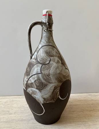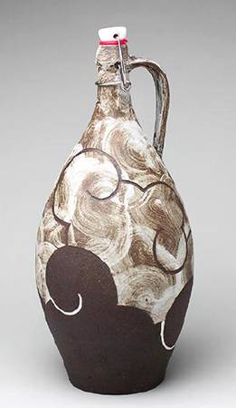 White and brown stoneware with an embedded metal hinged white and red gasket cap.