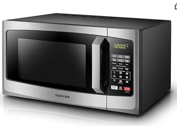 Silver stainless steel Toshiba microwave. Color of door frame is stainless steel, enclosure is black.