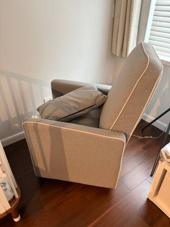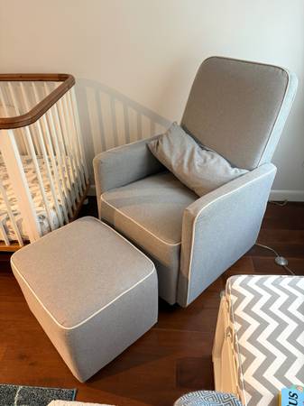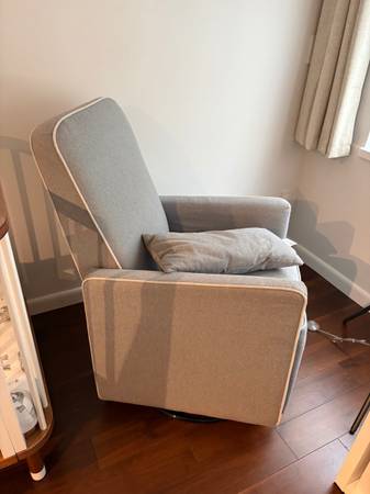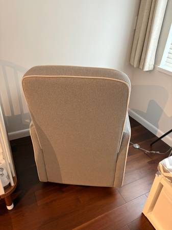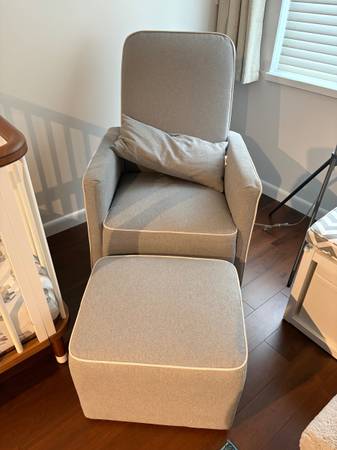 Selling a DaVinci Olive Upholstered Swivel Glider with Bonus Ottoman (Grey with Cream Piping) — recently purchased, in excellent condition, lightly used, like new, and perfect for a nursery or cozy corner. Selling as kids are outgrowing it. Purchased new for over $200.