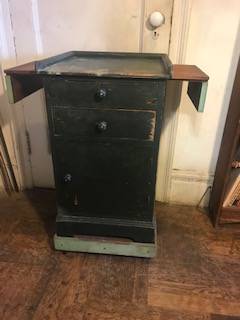 This table is absolutely rock solid, well-designed, and worth preserving. It is painted dark green, but the sliding plank is unfinished (has some water marks) and the base and side panels are light green, the favorite color of FE Bagger. The sliding plank can be removed by unscrewing one of the side panels.