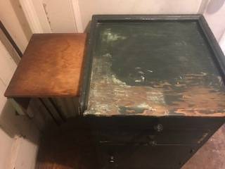 Damage: The finish is damaged on the top from water and heavy use--a true patina of age. It needs sanding and painting there. There is one gash on the door of the cabinet and some damage to the edge of one drawer, which was stuck at one point and pried open. It has been recently sanded on the side so that it now moves easily. Except for the top, it could all just be repainted.