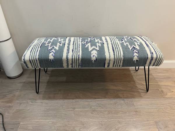 Stylish upholstered bench with modern black hairpin legs. Features a unique striped woven fabric design in gray, white, and blue tones. Perfect for an entryway, bedroom, or living room. 📏...