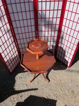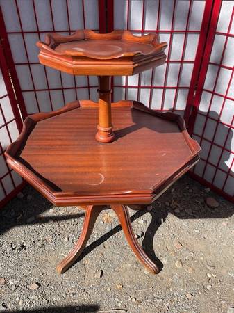 Vintage antique solid mahogany 2 tiered pedestal end table is in good shape. This can be stripped and refinished or used as is. This measures 23.5”w x 33”h.