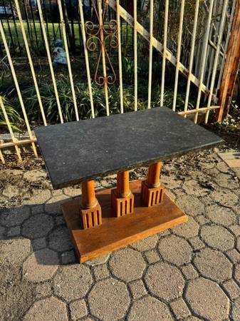 Vintage Black stone top and walnut coffee table is in good shape. The top is permanently attached. The base can be sanded and refinished or painted for new look. This measures 26” wide x 16” deep x 16” tall.