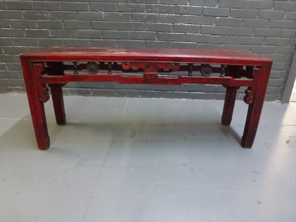 This vintage Chinese simple Ming style coins apron rectangular coffee table is a handmade piece of home decor that adds a retro touch to any living space. The table is fully assembled and features a brown wood tabletop with a matte finish. With dimensions of 46 inches in length, 19.5 inches in height, and 13.5 inches in width, this unique and original coffee table is perfect for indoor use and weighs 20 lbs. The design includes a handmade brand and traditional style elements, making it a standout piece in your home.