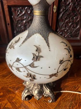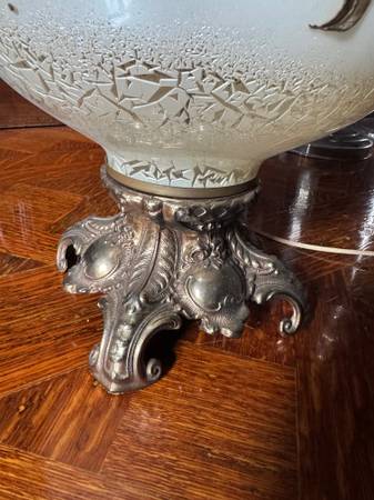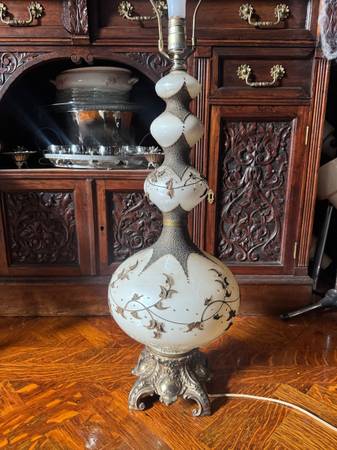 Vintage Hollywood regency frosted glass table lamp is in good shape. This unique lamp will surely be a show stopper with the height of it alone. This has brass and gold accents. The lamp measures 11” diameter 40” tall.
