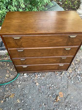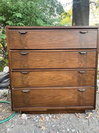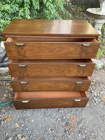 Vintage mid century modern walnut and burled walnut four drawer dresser is in good shape. This is made of a laminate for durability and brass hardware. This dresser can be used as is or can add legs to raise the height of it. This has some minor chipping and wear which is shown in the photos. This measures 36”w d 18”d x 37”h with the drawers being 32.5”w x 6, 6, 6, 7”d.