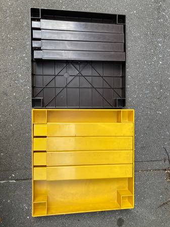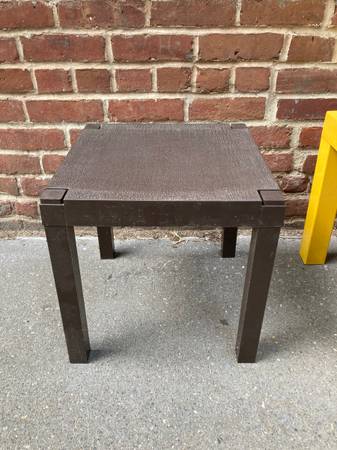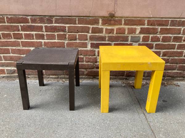 I am parting with a nice vintage pair of parson end tables. They are a great design and can be used indoors or outdoors. They have moved all over my apartment over the years. Super useful, but could also be good for a kid’s room. Many a 1970s patio sported these tables.