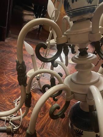 Vintage porcelain country French colonial blue and white chandelier is in good shape. This is made of metal with brass and porcelain accents. This grand chandelier measures 30”w x 32”h.
