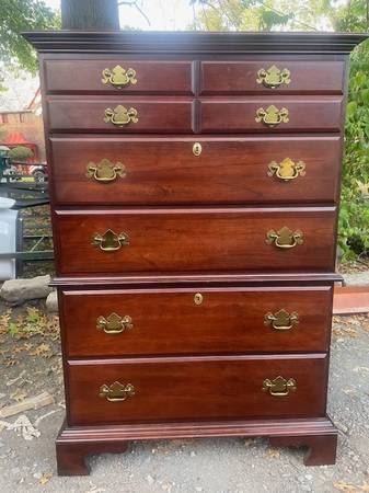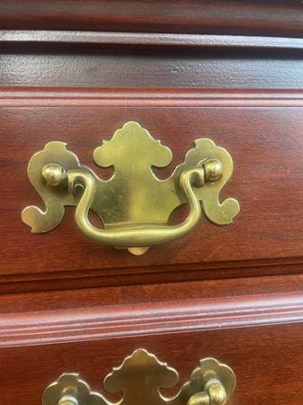 Vintage solid cherry traditional 5 drawer dresser is in great shape. This is made of solid wood and can be used as is or paint it to give it a new look. The drawers are all dovetailed and open and close easily. This measures 35”w x 18”d x 51”h with the drawers at 29.5”w x 5, 5, 5, 6, 6”d.