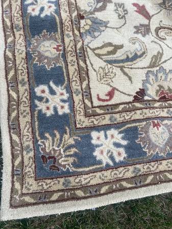 Vintage Surya blue and cream wool carpet is in great shape. This is 100% wool and made in India. This has a wear mark on the back side of the lining which does not affect the quality of the carpet. This measures 7'6" x 9'6" x .87" thick.