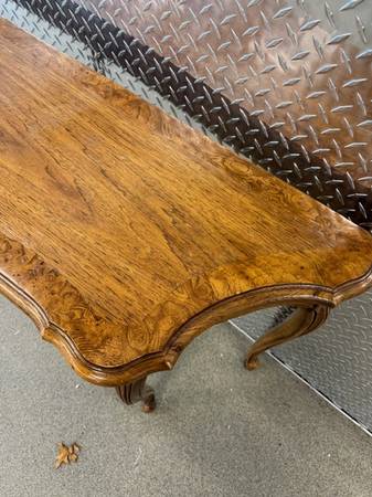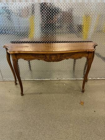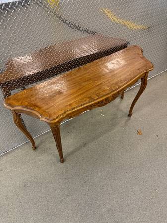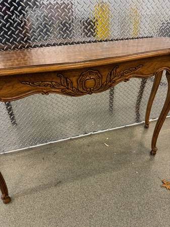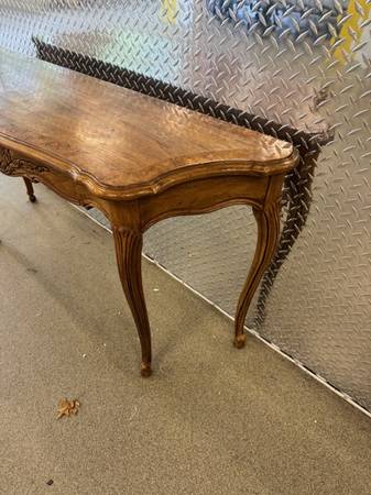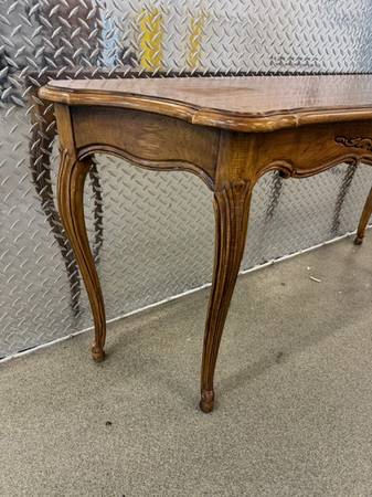 Vintage walnut French style console table by Thomasville is in good shape. This has a gorgeous burled walnut band around the top. There is some slight wearing which can be stripped and refinished to try and match the piece. This measures 55"w x 16"d x 28"h.