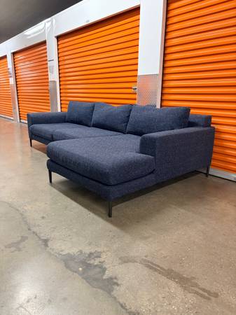 This 2020 West Elm Harper 2 piece bumper chaise sectional sofa is in great condition. It has No rips or tears with no visible marks or stains. Its Deco Weave Midnight materials feel very plush and premium while its lounge deep legroom and design looks elegant and contemporary. This sofa is perfect for any room sized living space.