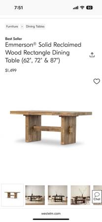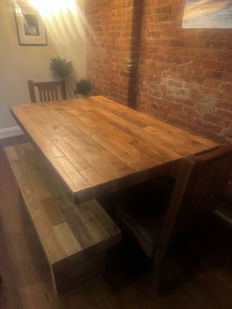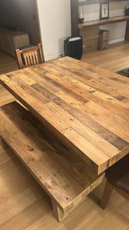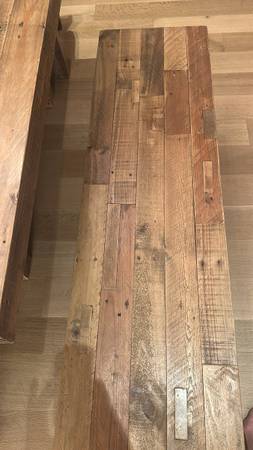 This dining table is gorgeous and in pristine condition. Reclaimed wood finish in a medium pine coloring (not light, not dark).