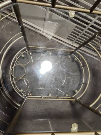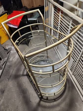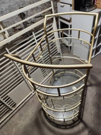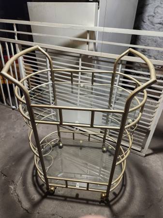 In EXCELLENT condition. Four wheeled (with no-roll brake stoppers) two-tier glass shelved bar cart. 36" tall 24" wide and 16" deep. Bottom shelf has three round wine bottle loops to stabilize taller bottles. Beautiful, useful piece for various decor schemes. Originally $178.99 plus tax and shipping. Lightweight but sturdy and unmarred.