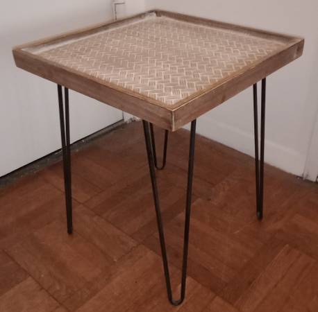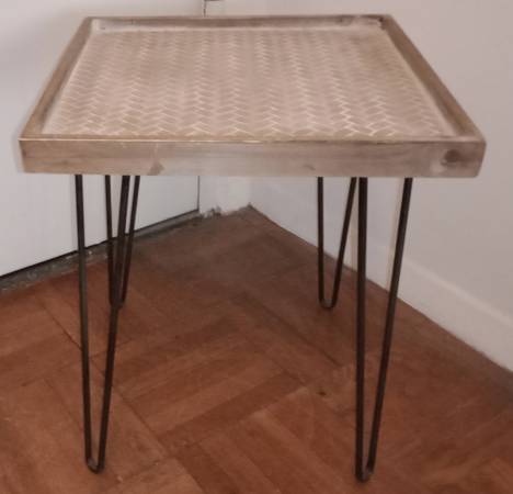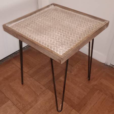 Whitewashed Herringbone Side Table with Hair Pin Legs $40 Cash Only Features: Rustic / weathered frame with raised lip Square table top Metal legs Nightstand Measurements: Height: 18 - 1/4” Square...