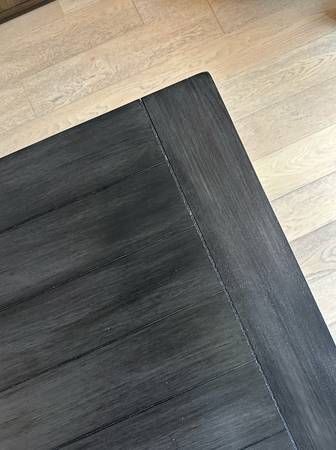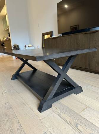 Dark espresso wood/black coffee table with minor imperfections from wear. Overall in great condition, relatively lightweight for a coffee table. Solid wood and veneer.