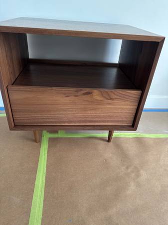 The THN .85 Nightstand speaks to the minimalist style that is found at the heart of all ARTLESS designs. These pieces feature one drawer or the bottom in a natural walnut finish. The nightstand is made of a solid walnut frame and a lacquered baltic birch plywood drawer or a solid walnut drawer. The solid walnut becomes a protective box enveloping the drawer boxes. The functionality and mass of the drawer is exacerbated with the visual appeal of an open, see-through space. We added custom mid-century like legs to raise the height of both nightstands by 6 inches. These have not been used and are in perfect condition. They have no scratches or blemishes of any kind.