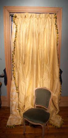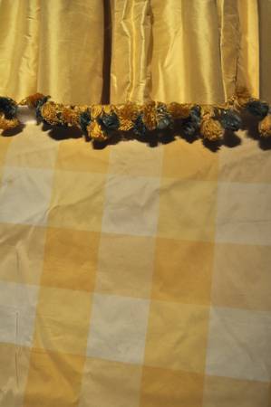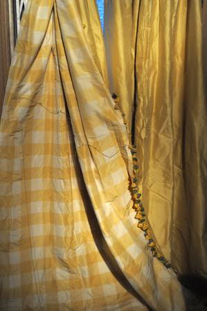 This is a pair of luxurious drapes that were once part of a traditional townhouse in the Village that was restored. On the front side, they are a gold silk dupioni (raw silk). On the back side, they are the same yellow against white plaid, also 100% silk. They are trimmed in a yellow/green tassel fringe. (color in photos is a bit off. The front side is a golden/butter color.) On the back side are metal loops and a cord to provide that tailored gathering when pulling them open.