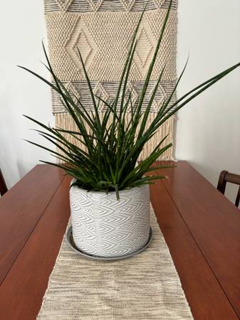 Large Spikey Sansevieria Fernwood in ceramic pot: super resilient plant that can tolerate most conditions, though they prefer more light. best watered infrequently - this one has grown a lot and thrived with bi weekly water.