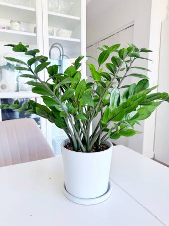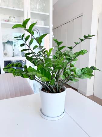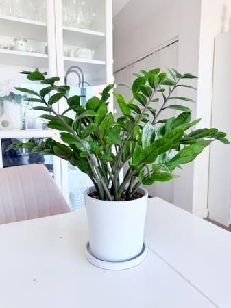 Large ZZ plant, Zamioculcas Zamiifolia: This 4-year-old stunning, low maintenance plant is in perfect shape and size, boasting numerous gorgeous leaves. It comes in a beautiful 7" H&M home white ceramic planter with a matching saucer, valued at $35. The plant measures approximately 22" in height and 25" in width. Seeking a lovely new owner. - $95