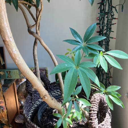 Umbrella Tree 5’ tall with base 6’ tall, 5’ wide. Healthy. Growing as pictured. Not a money tree but leaves look like mini-money tree. This is a very dainty tree. Easy to care for as well. Comes with the basket. Plastic potted witg plate at bottom. Cash only. Pick up only. Midtown West.