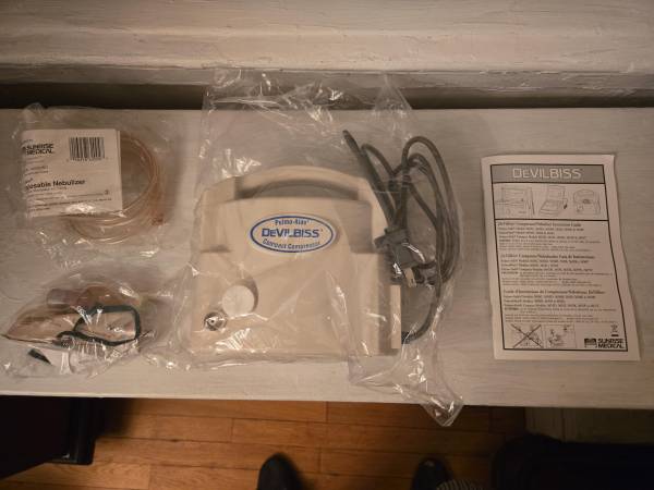 This is a DeVilbiss Pulmo-Aide compact compressor, model 3655D. If it was used at all, it was used once or twice and then put away. Perfect condition, with all the accessories pictured (the mask is unopened). Come pick up or I can ship it to you. Note that phone is a landline, no texts.
