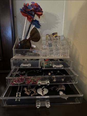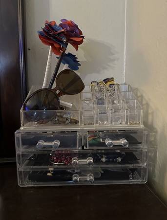 Beautiful jewelry vanity for all jewelries separate storage; rings, watches, bracelets, champs, etc. great condition. 5” W x 6” Length x 8” H. Pickup in Manhattan. Firm