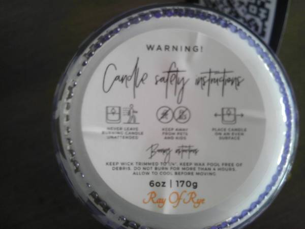 GREAT GIFT! Retail $24.00 Ray Of Rye Scents Candle 6oz/170g glass jar with metal lid Incl. a tag message stating: Thank you. Best wishes for the season. app. 3.5in H x 2.5in D