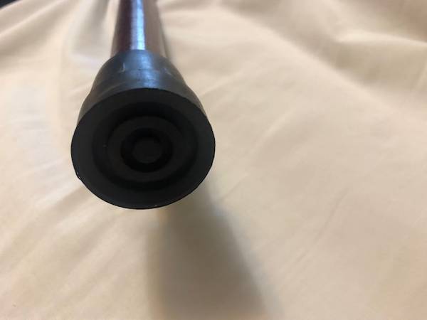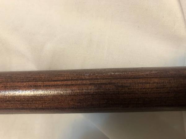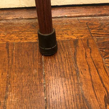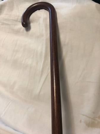 Vintage wooden cane, 36” from crook of cane to bottom of rubber tip. The tip is marked NEV-A-SLIP 392. It is a hard wood. The cane looks like its never been used. It has some minor scratches.