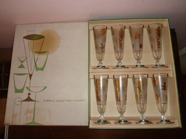 Libbey's set of 8 impeccable vintage pilsner glasses with gold leaves, in original shopworn box - $32/set of 8