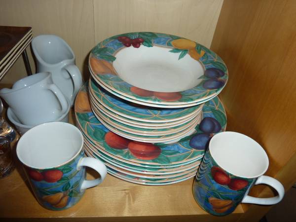 18 pc Victoria Beale Forbidden Fruit china - 7 dinner plates, 7 salad plates, 2 soup bowls, 2 mugs - $70/all