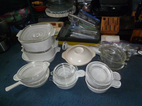 Corningware and other white casseroles - mostly $6-$10, larger/rarer $15