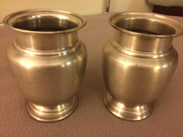 * Pair of handsome, classic, brushed silvery vases. Each is 6" high, 4" diameter.