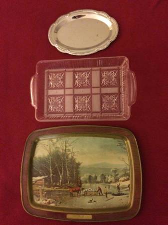 * 3 Assorted serving trays. Winter scene on metal tray, vintage, 14.5" by 11". Clear plastic tray, looks like crystal, 13.5" by 8". Silvery finish oval metal tray, 9.5" by 6". All 3 for $8.