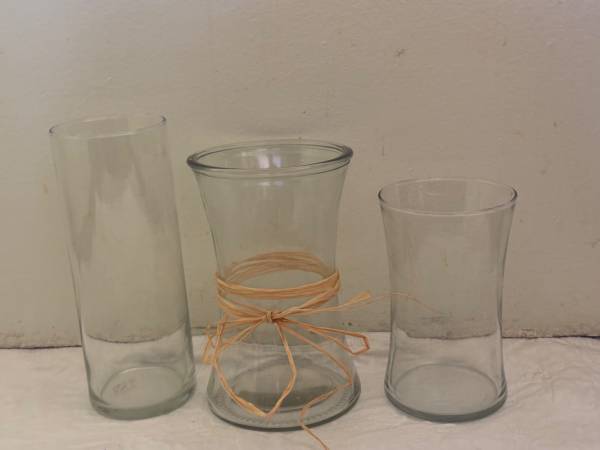 These glass vases display cut flowers beautifully. The heights are: 9”, 8”, 6 1/2”. All of the vases are in excellent condition.