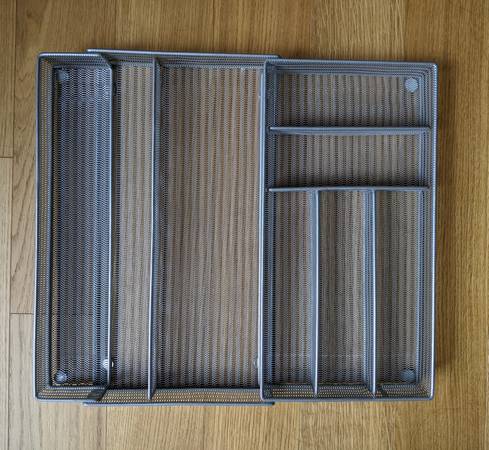 11.5"(w)x16"(h)x2.5"(d) expandable to 19"x16"x2.5" mesh organizer. Good for desk drawer organizing or kitchen drawer organizing, or more. In 'like new' condition.