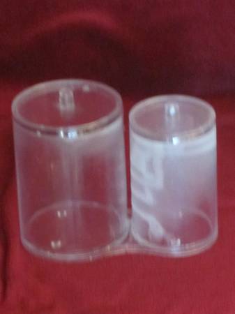 acrylic cotton ball & q-tip holder with 2 lids, 4 1/4" high, 8" wide, has stains