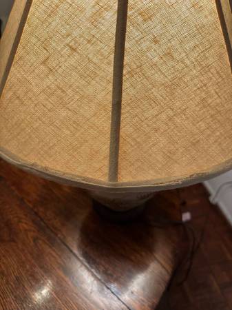 Fans of Chinese style lamps Rejoice! This gorgeous lamp features a gold embossed dragon extending completely around the base. The lampshade is a bit frayed at the seams, the top screw has a small piece broken off, but nevertheless, this lamp is beautiful. Lamp itself is in excellent condition, the lampshade is in good condition.