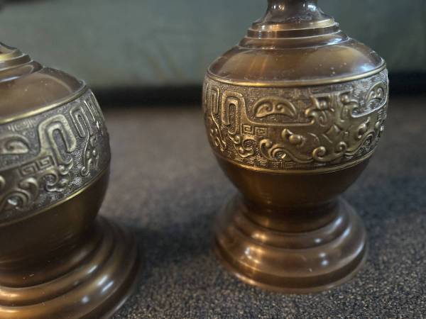 Tall, heavy, with a hollow middle. Designed to be a set of lamp bases, with openings on both ends, as well as a smaller opening at the base for wiring.