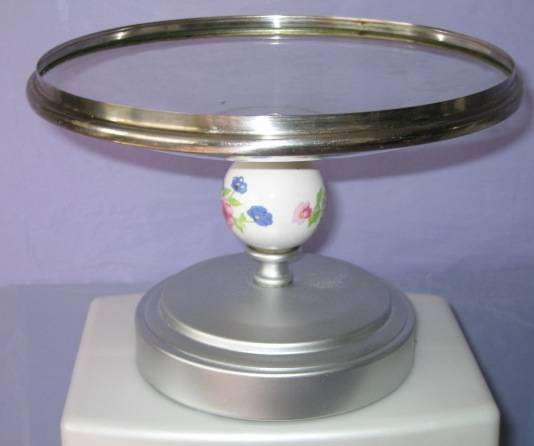 porcelain ROUND FLORAL BALL stem. glass top with silver metal edge. silver metal base7 1/2" high, 10" diameter - $12. (phone number please)