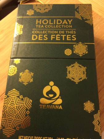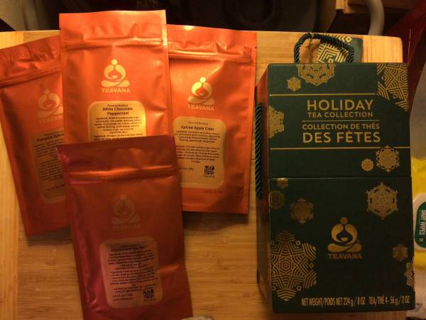 Luxe Boxed Collection of 4 packages of loose teas: Pumpkin Spice Brulee (flavored oolong tea), White Chocolate Peppermint (flavored rooibos), Spiced Apple Cider (flavored rooibos), and Coco Caramel Sea Salt (herbal infusion). Each package has 2 ounces. Includes attached coordinating gift tag.