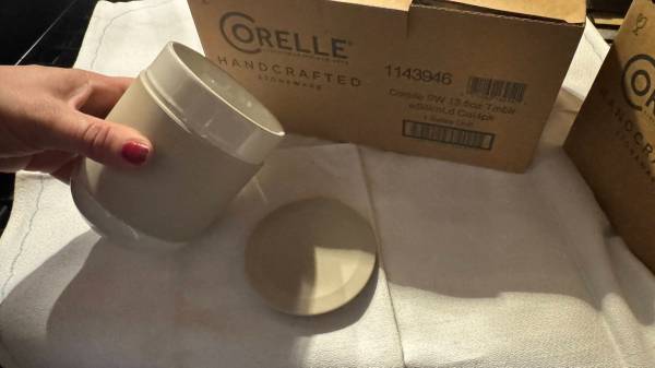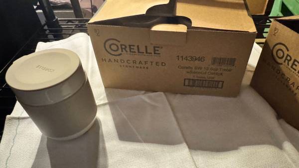 Selling a new boxed set of 4 Corelle stoneware tumblers (13.5oz) with silicone lids.