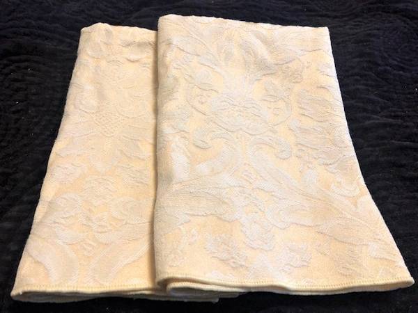 2 cream & white damask napkins, 19 1/4” by 16 1/4”, good condition