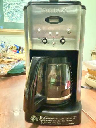 Cuisinart 12-cup coffee maker with glass carafe, fully programmable. The toggle switch doesn’t always work and has to be jiggled with.