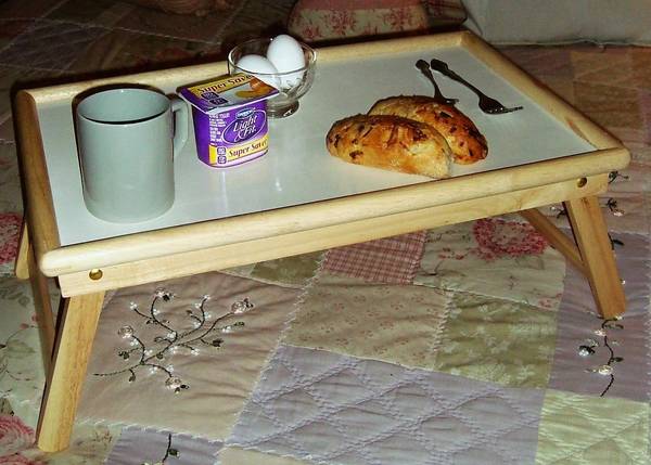 Folding Lap Desk / Bed Tray Table $10 Cash Only Solid wood with easy to clean white melamine top. Simply fold legs and use as a serving tray and for easy storage Great for working - eating in bed or...