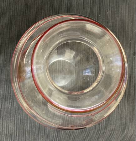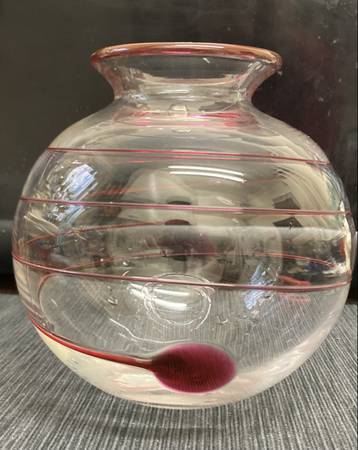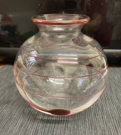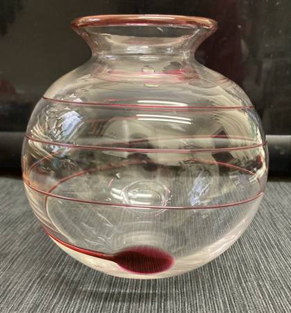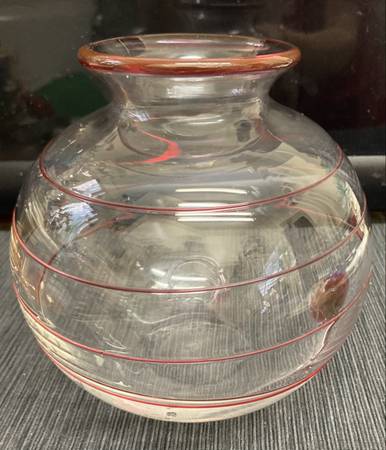 This 6" vase is clear hand blown glass and has a raspberry red spiral swirl going around the lip and down to the bottom where it ends with a bold dot. Mid century modern design, most likely from the 1950s-60s, done in a Murano style.