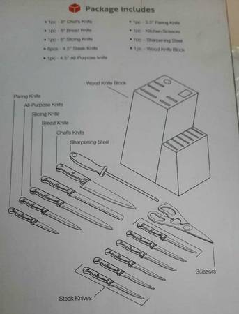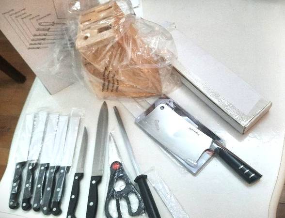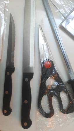 Knife Set new, never used. The set is missing the Chef Knife and Bread Knife from the original set, but also includes a 6" Cleaver Knife. Items shown in photos